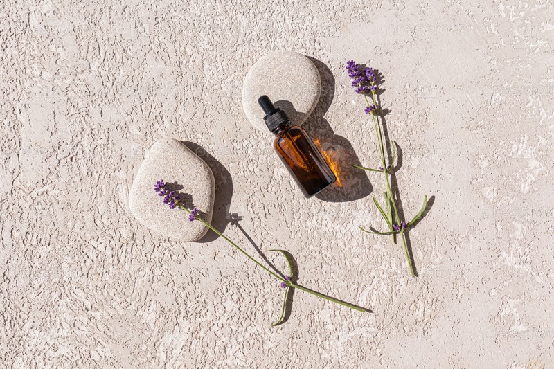 Стеклянная бутылка эфирного масла лаванды со свежими цветами лаванды, концепция ароматерапевтического спа-массажа. Лаванда олеум