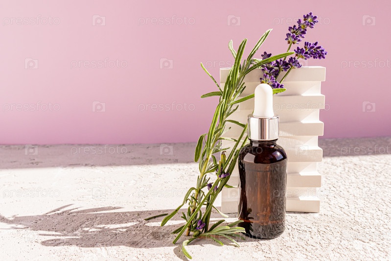 Натуральная косметика, сыворотка на основе лавандового масла в бутылке из темного стекла с пипеткой на фоне цветов и белого подиума. Органический уход