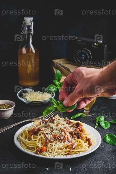 Спагетти с соусом болоньезе и тертым сыром пармезан