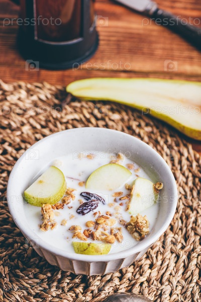 Домашняя гранола со свежей грушей и молоком в винтажной миске