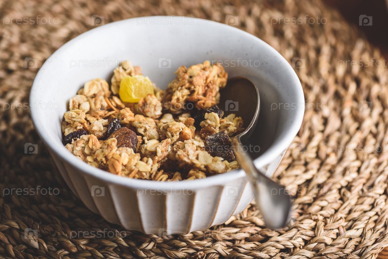 Винтажная миска с домашней гранолой и сухофруктами для здорового завтрака