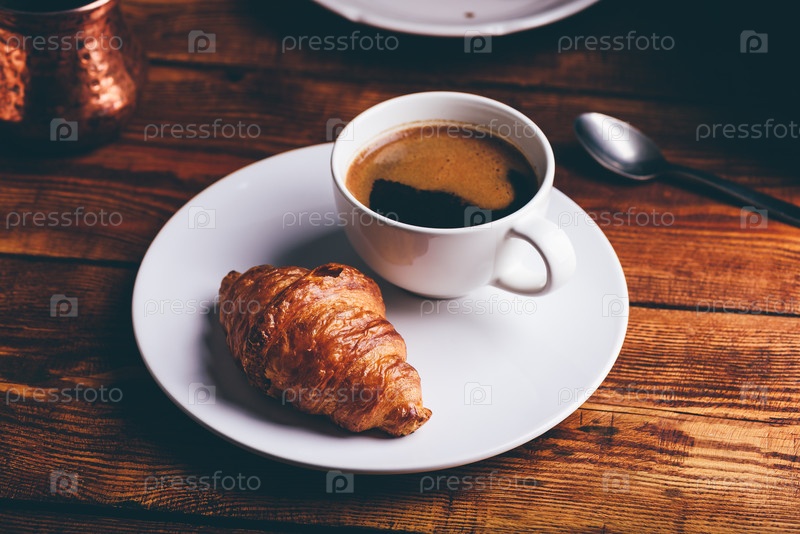 Чашка черного кофе и свежий круассан на деревянном столе