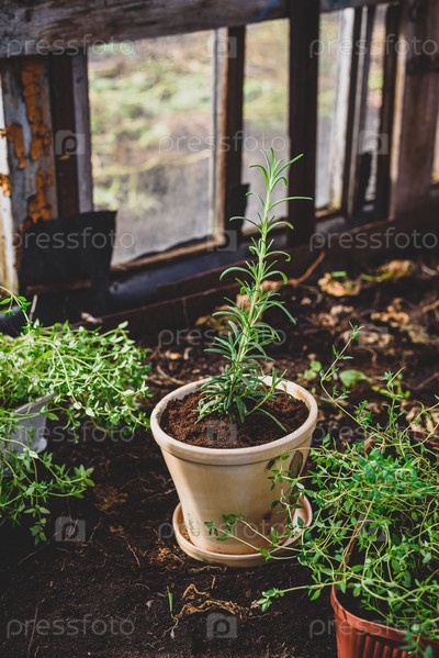 Свежепересаженный розмарин с грядки в саду на заднем дворе
