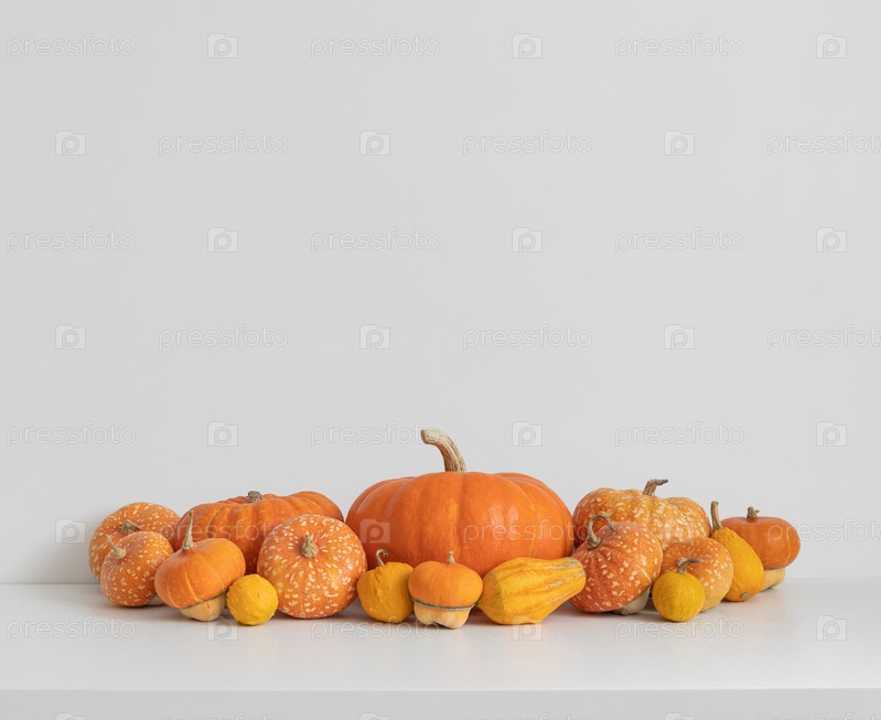 Осенний урожай с разными тыквами и тыквой на белом фоне с копировальным пространством. Осенние праздничные украшения на День Благодарения или Хэллоуин. Органические овощи