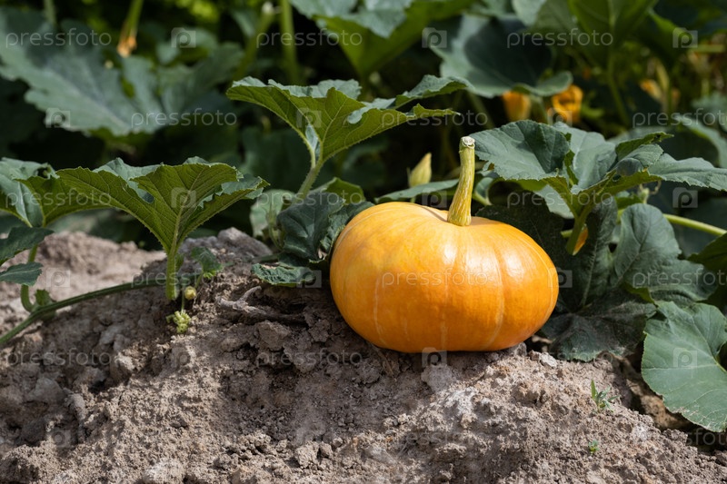 Большая оранжевая тыква в огороде. Осенний урожай. Выращивание тыквы. Органические овощи