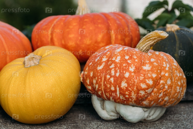Спелые оранжевые тыквы в саду. Время благодарения. Свежий урожай тыквы. Органическое овощеводство