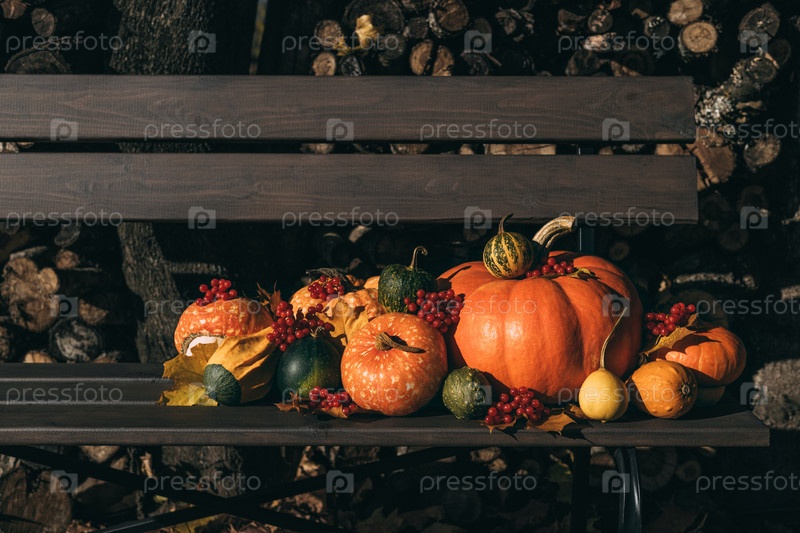 Красивая осенняя композиция, различные тыквы, листья и ягоды на деревянной скамейке. Овощи, выращенные в саду. Скопируйте пространство. День Благодарения или Хэллоуин