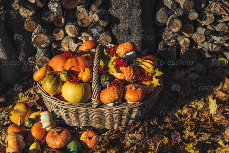 Тыквы в корзине осенней композиции. Различные тыквы и тыквы, кленовые листья, красные ягоды в плетеной корзине. Осенний урожай. Органические фермерские овощи. Концепция Дня Благодарения