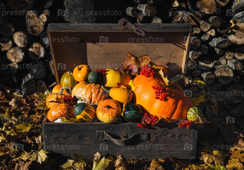 Тыквы и кабачки, листья и ягоды в старом чемодане. Красивая осенняя композиция. Праздничный осенний декор на День Благодарения или Хэллоуин