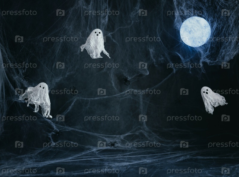 Хэллоуин темный фон с призраками, светящейся луной и паутиной с копировальным пространством. Изображение для монтажа или демонстрации вашей продукции. Призраки из марли и крахмала. Хэллоуин декор