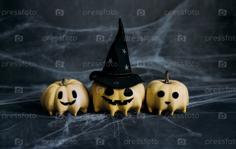 Хэллоуинские тыквы в шляпе ведьмы на темно-сером фоне с паутиной. Тыквенная голова Джека или Фонаря. Концепция Хэллоуина. Тыквы в форме привидений