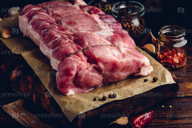 Сырая свиная корейка на разделочной доске