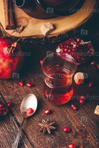 Черный чай в стакане арабского чая со свежим гранатом и некоторыми специями