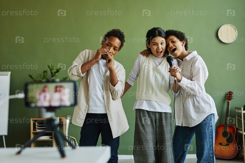 Две межкультурные девушки поют в микрофоне, а мальчик играет на гармонике