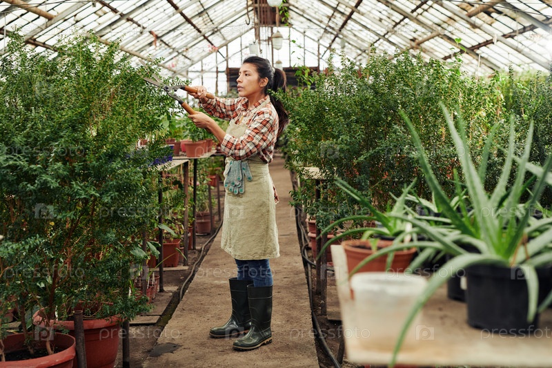 Женщина, режущая растение в теплице
