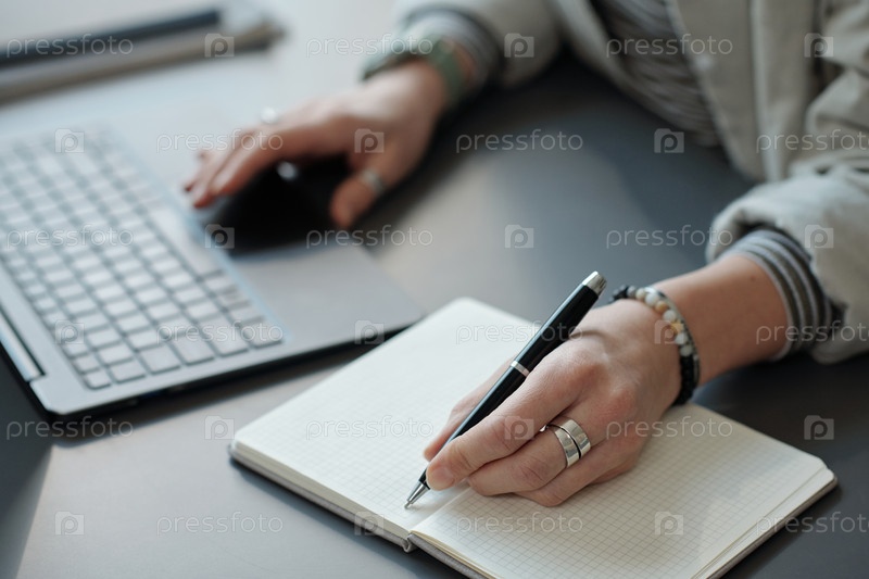 Руки молодой бизнес-жены с ручкой на пустой странице блокнота