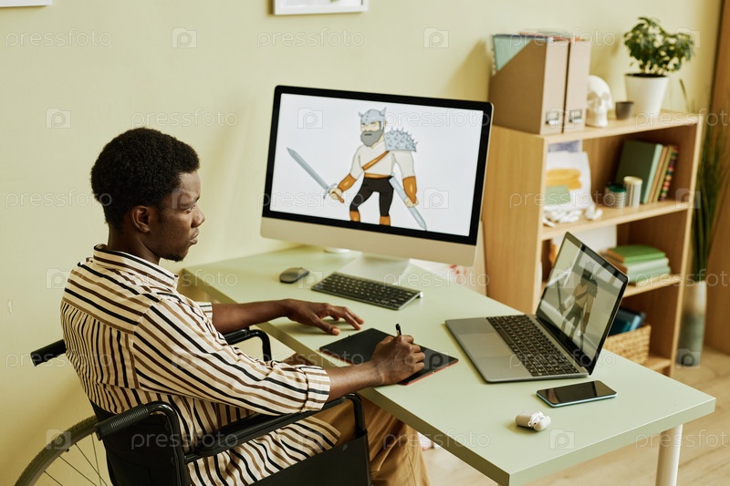 Молодой серьезный цифровой художник с инвалидностью смотрит на экран ноутбука