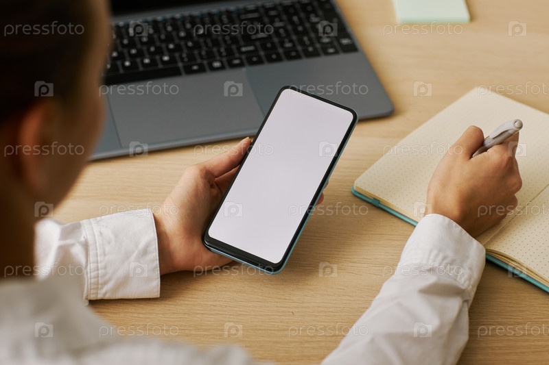 Женщина держит телефон с макетом белого экрана и делает заметки за столом