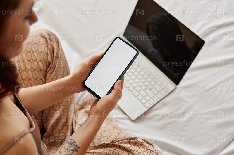Вид сверху молодой женщины, использующей ноутбук и телефон с пустым белым экраном на кровати
