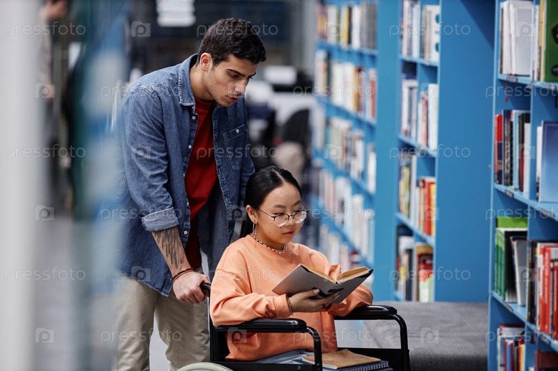 Азиатская девочка-инвалид в библиотеке выбирает книги