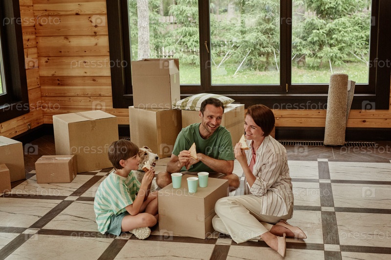 Счастливая семья в новом доме наслаждается обедом с импровизированным столом