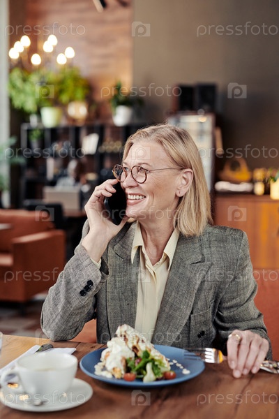 Деловая женщина, пользующаяся телефоном во время обеда