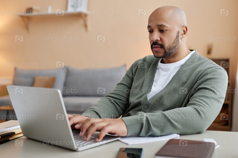 Взрослый чернокожий мужчина использует ноутбук, работающий из дома в обстановке