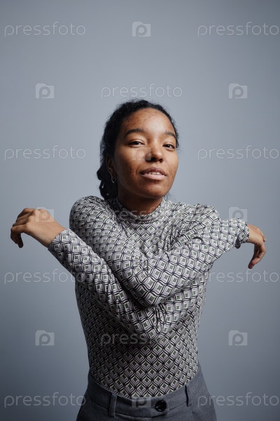 Молодая черная женщина танцует на стальном сером фоне и смотрит в камеру
