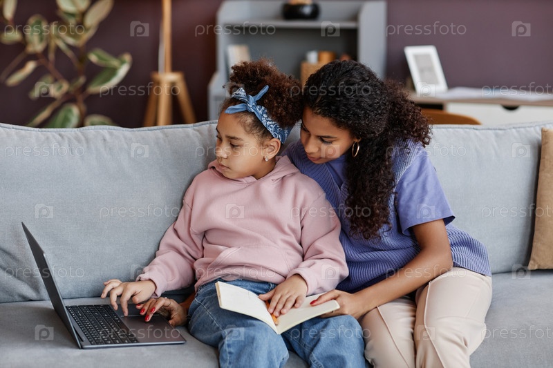 Молодая чернокожая женщина учит дочь с помощью ноутбука, сидящих вместе на диване