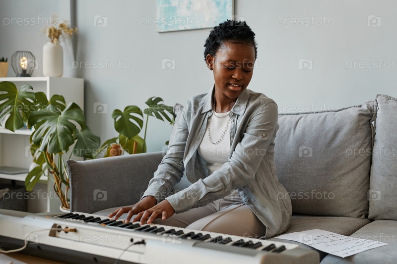 Улыбающаяся женщина играет на цифровом пианино