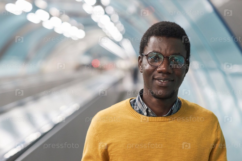 Африканский американец, стоящий на эскалаторе