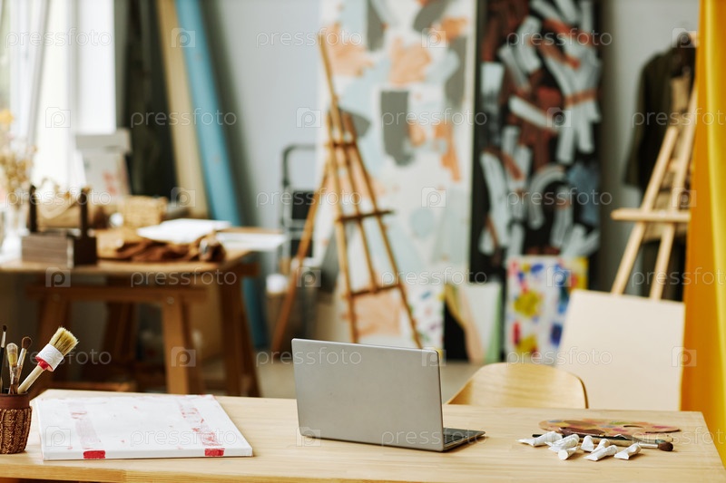 Ноутбук стоит среди кучки кистей и труб с акриловой краской