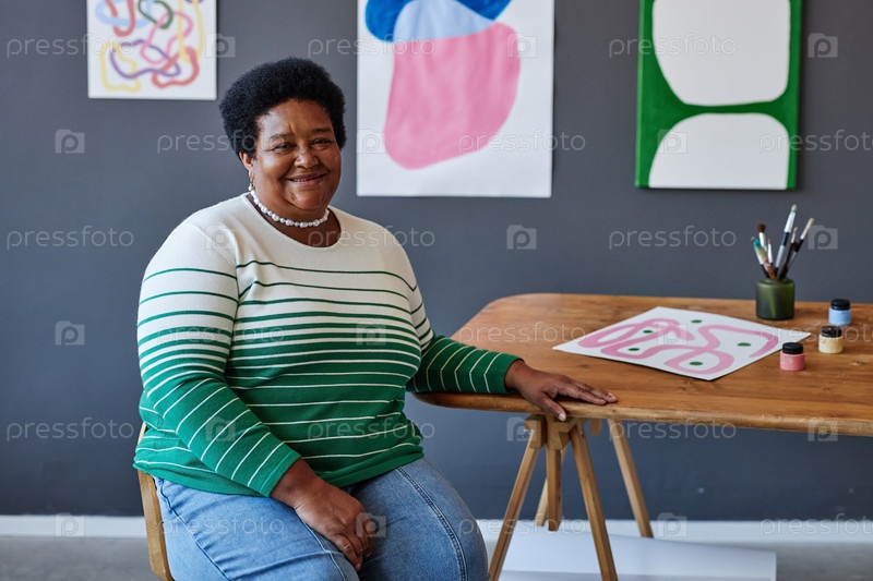Счастливый опытный учитель живописи сидит у рабочего места в студии