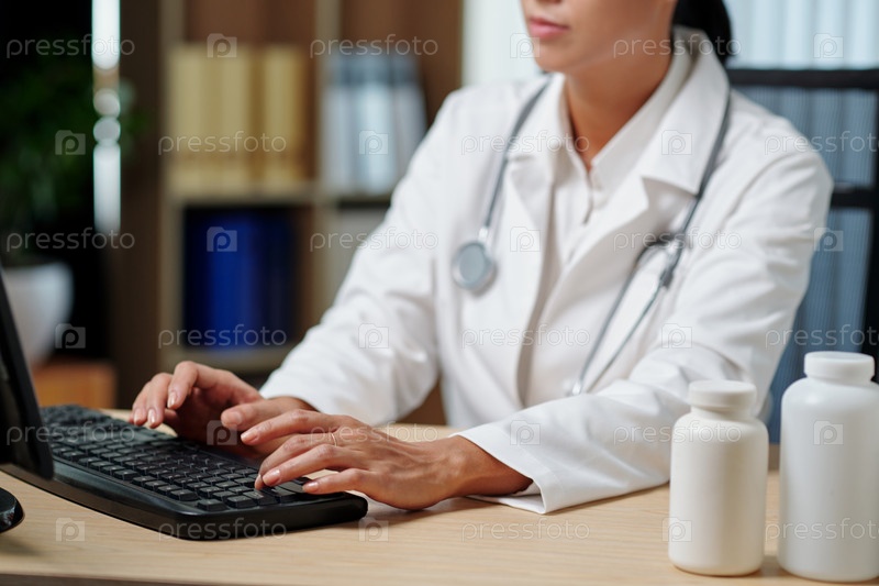 Близкий план рук молодого врача в лабораторном пальто, печатающего на клавиатуре