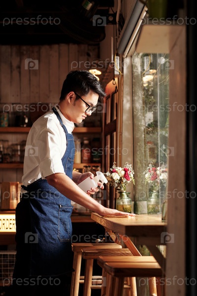 Кофе-шоп рабочий стирает поверхности