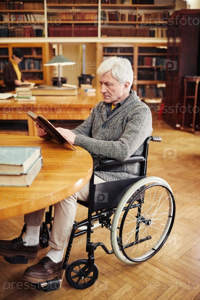 Старший человек на инвалидной коляске читает книгу в библиотеке