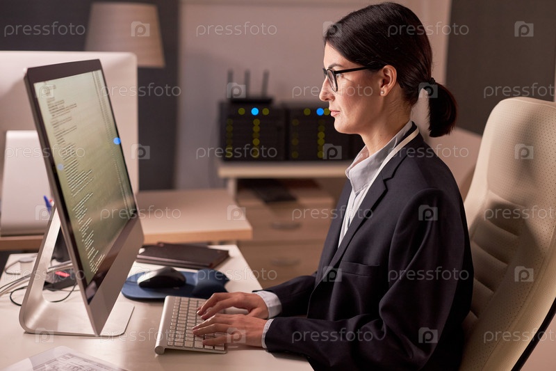 Серьезная бизнесвумен, использующая компьютер во время ночной работы в ИТ-офисе
