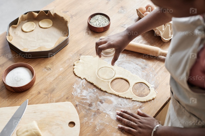 Обрезанная чернокожая женщина выпекает домашние кондитерские изделия и режет формы печенья