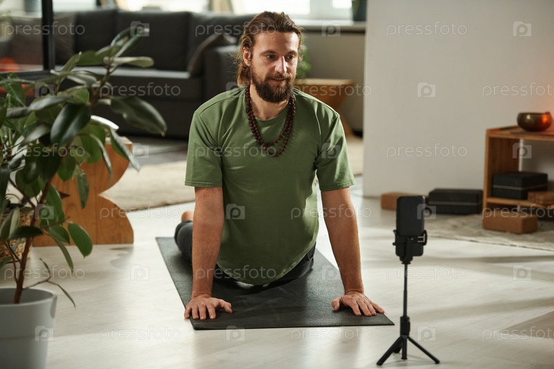 Мужчина снимает видео упражнений по йоге