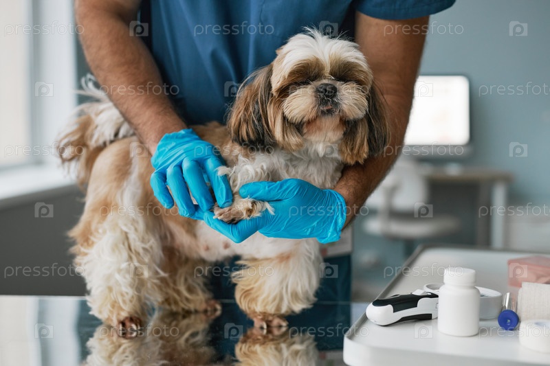Близкий план ветеринара в перчатках, осматривающего лапы и когти собаки