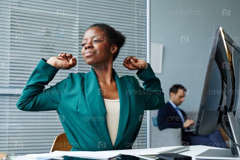 Женщина растягивается на рабочем месте, отдыхая после работы