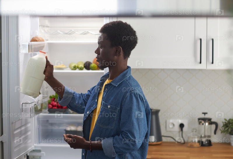 Чернокожий мужчина берет молоко из холодильника, готовит ужин дома