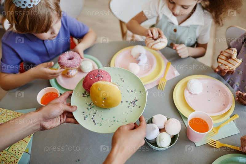Сверху вид крупный план женских рук, приносящих сладости на день рождения для детей