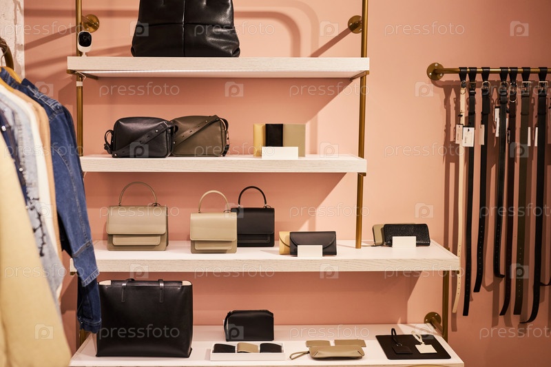 Дизайнерские сумки и сумочки на полке в магазине одежды