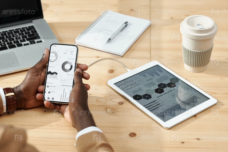 Бизнесмен, работающий с компьютерными устройствами за столом