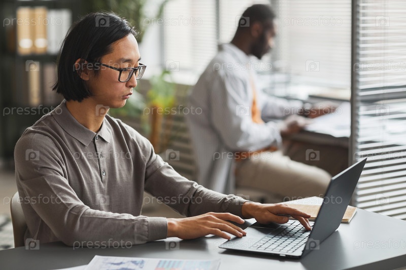 Мужчина, работающий с компьютером Азиатский человек