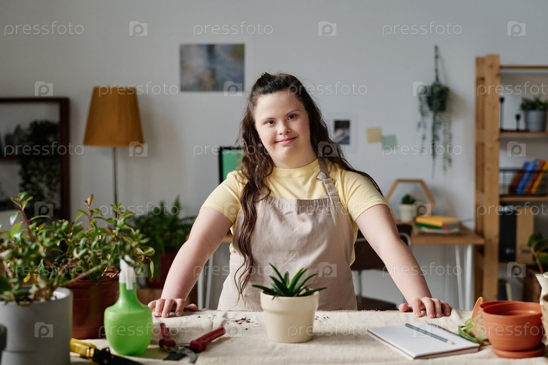 Девочка с синдромом Дауна сажает растения в горшки