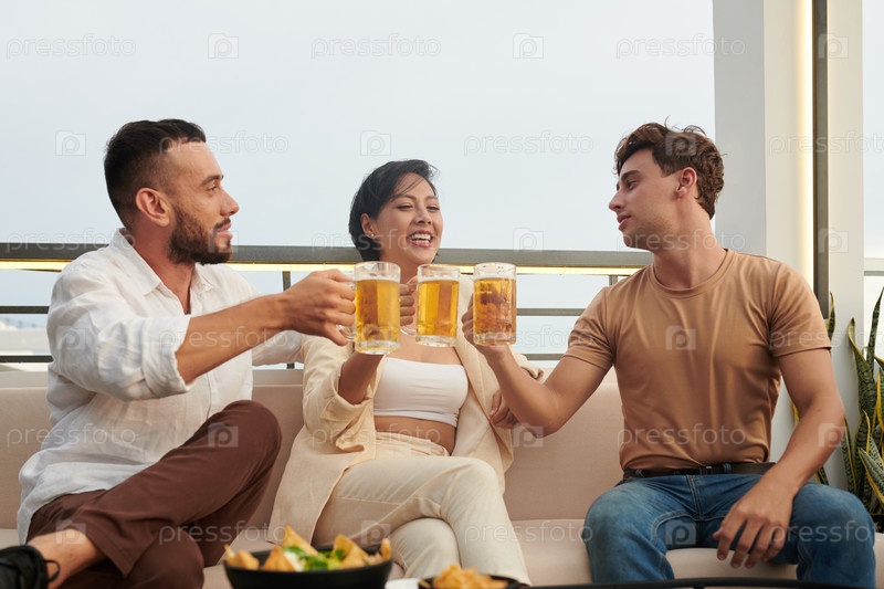 Друзья празднуют что-то в баре на крыше