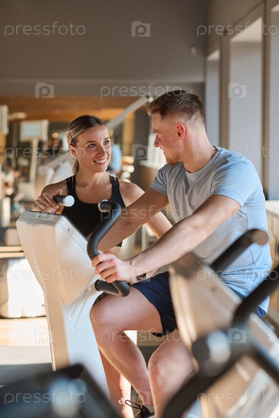 Мужчина тренируется вместе с тренером в тренажерном зале