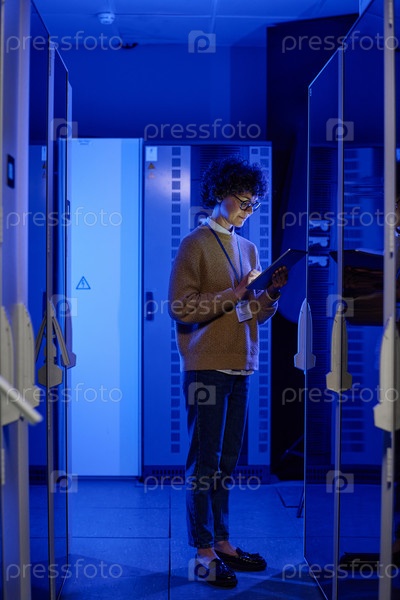 ИТ-техник, работающий на планшетном компьютере в шкафу сервера